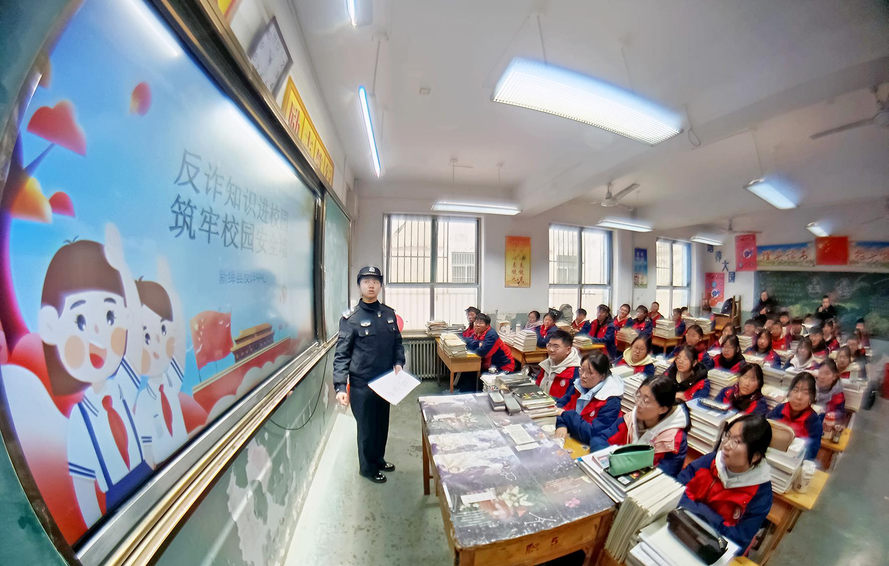 12月24日,山西省運城市新絳縣公安局反詐中心民警在新絳縣職業(yè)教育中心開展寒假前的反詐宣傳活動。
