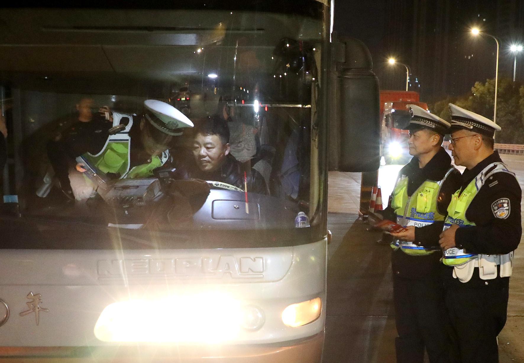 1月14日,江西省九江市公安局交管支隊(duì)第一大隊(duì)執(zhí)勤民警輔警在九江長(zhǎng)江一橋?qū)蛙?chē)進(jìn)行安全檢查。