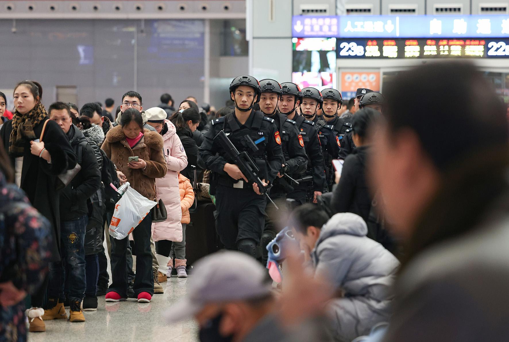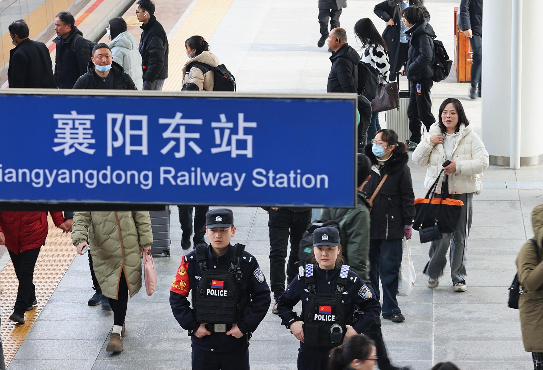 1月14日,襄陽(yáng)鐵路公安處民警在襄陽(yáng)東站執(zhí)勤,服務(wù)旅客。