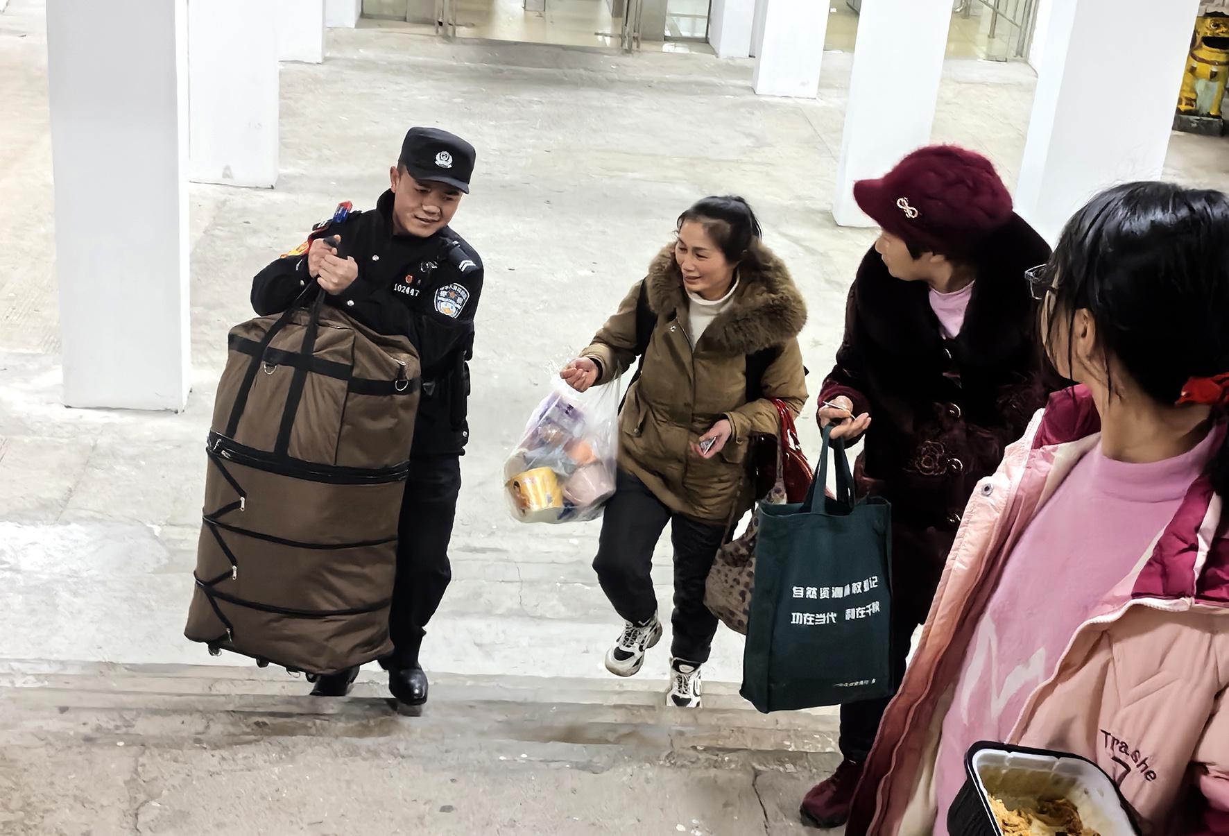 2月4日,成都鐵路公安局貴陽公安處銅仁南車站派出所民警幫助旅客搬運行李。