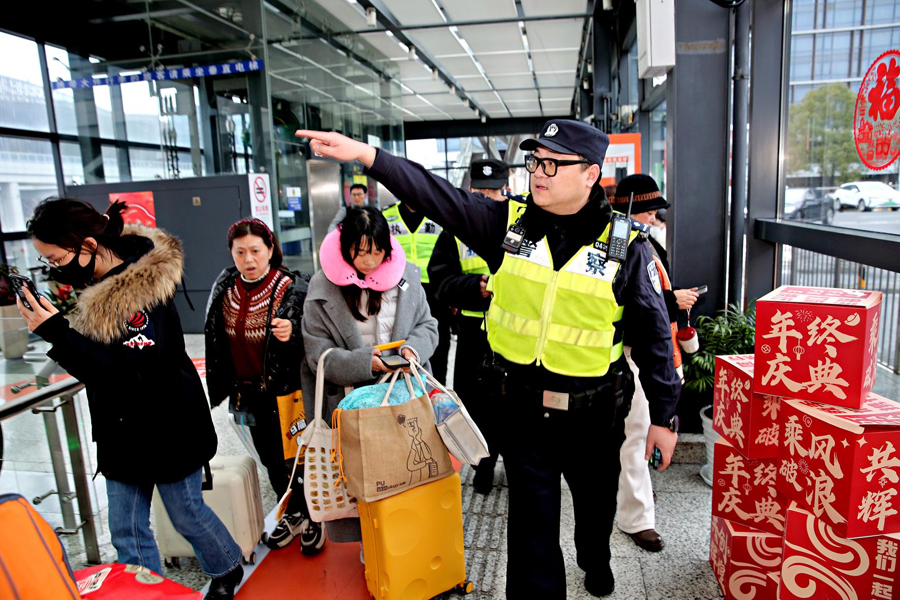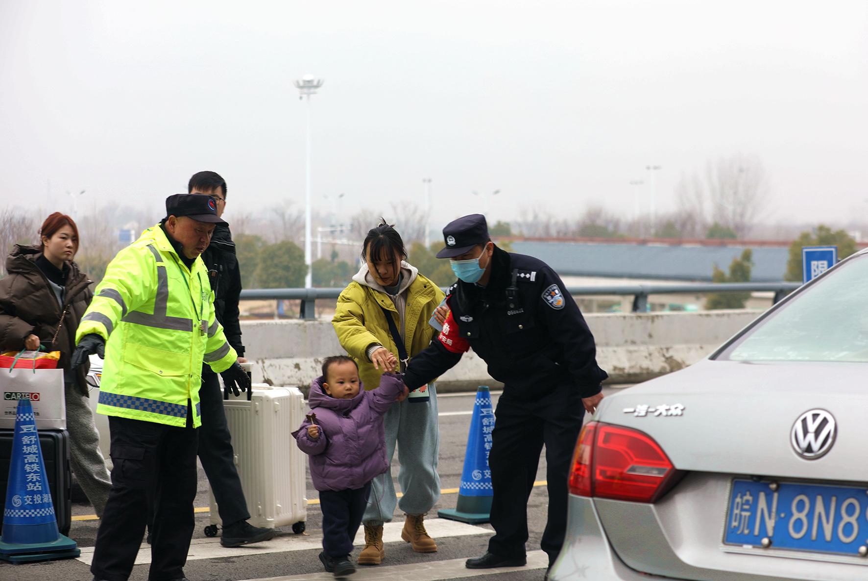 2月3日,農(nóng)歷正月初六。安徽省舒城縣高鐵東站迎來返程高峰。舒城縣公安局千人橋派出所高鐵東站警務站民警輔警在入站口平臺疏導交通、服務群眾,確保返程旅客平安出行。