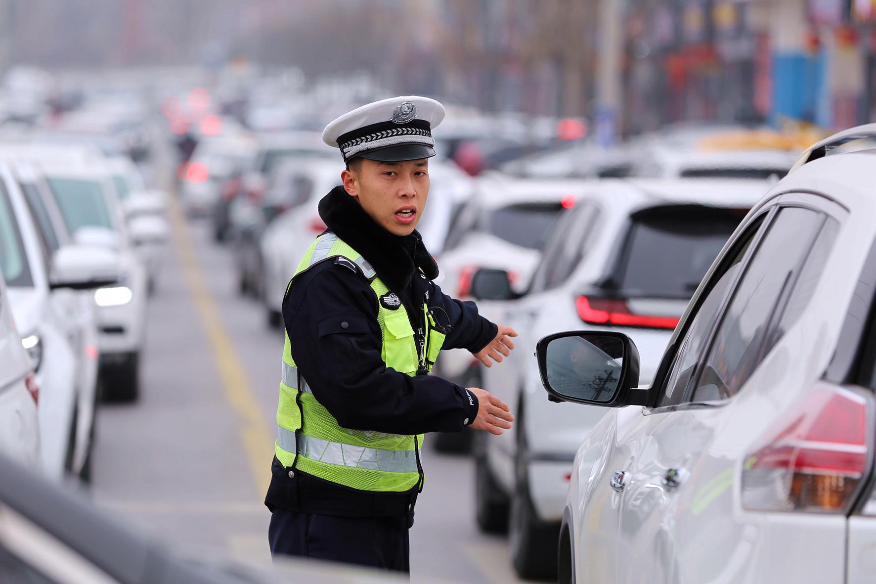 2月1日,陜西省渭南市潼關(guān)縣公安局交警大隊民輔警在景區(qū)主要路段指揮疏導交通。