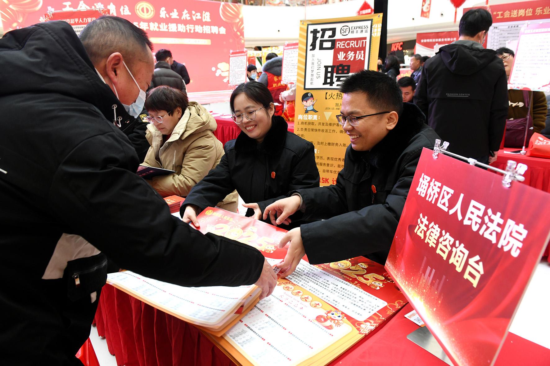 2月7日上午,安徽省宿州市埇橋區(qū)人民法院法官在“工會送崗位 樂業(yè)在江淮”蛇年新春首場大型招聘會現(xiàn)場為求職者“支招”答疑釋惑。