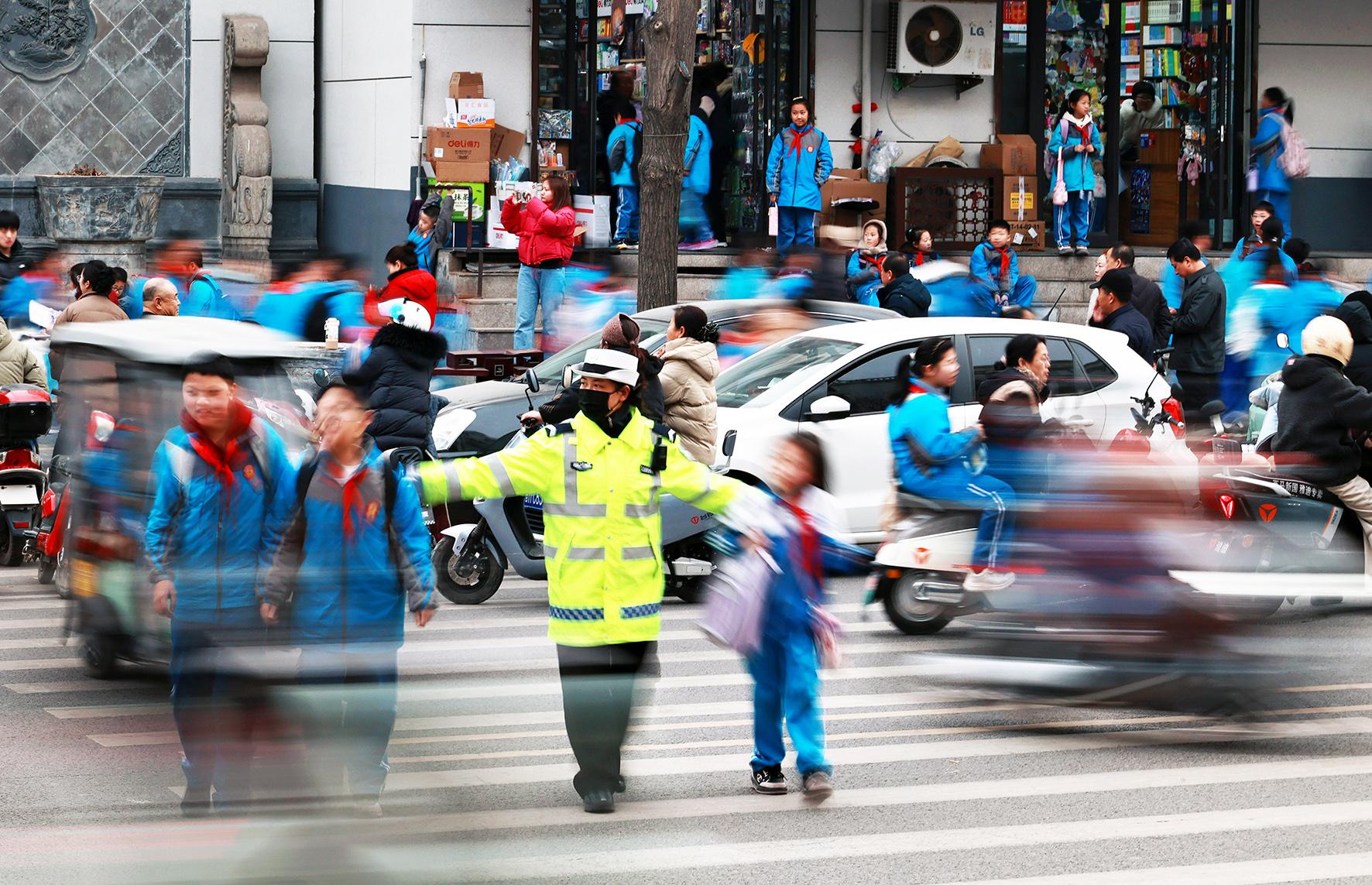 2月18日,山西省運(yùn)城市新絳縣交警大隊(duì)古城中隊(duì)“學(xué)雷鋒”護(hù)學(xué)崗一名輔警在西街實(shí)驗(yàn)小學(xué)校門口護(hù)送小學(xué)生安全通過斑馬線。