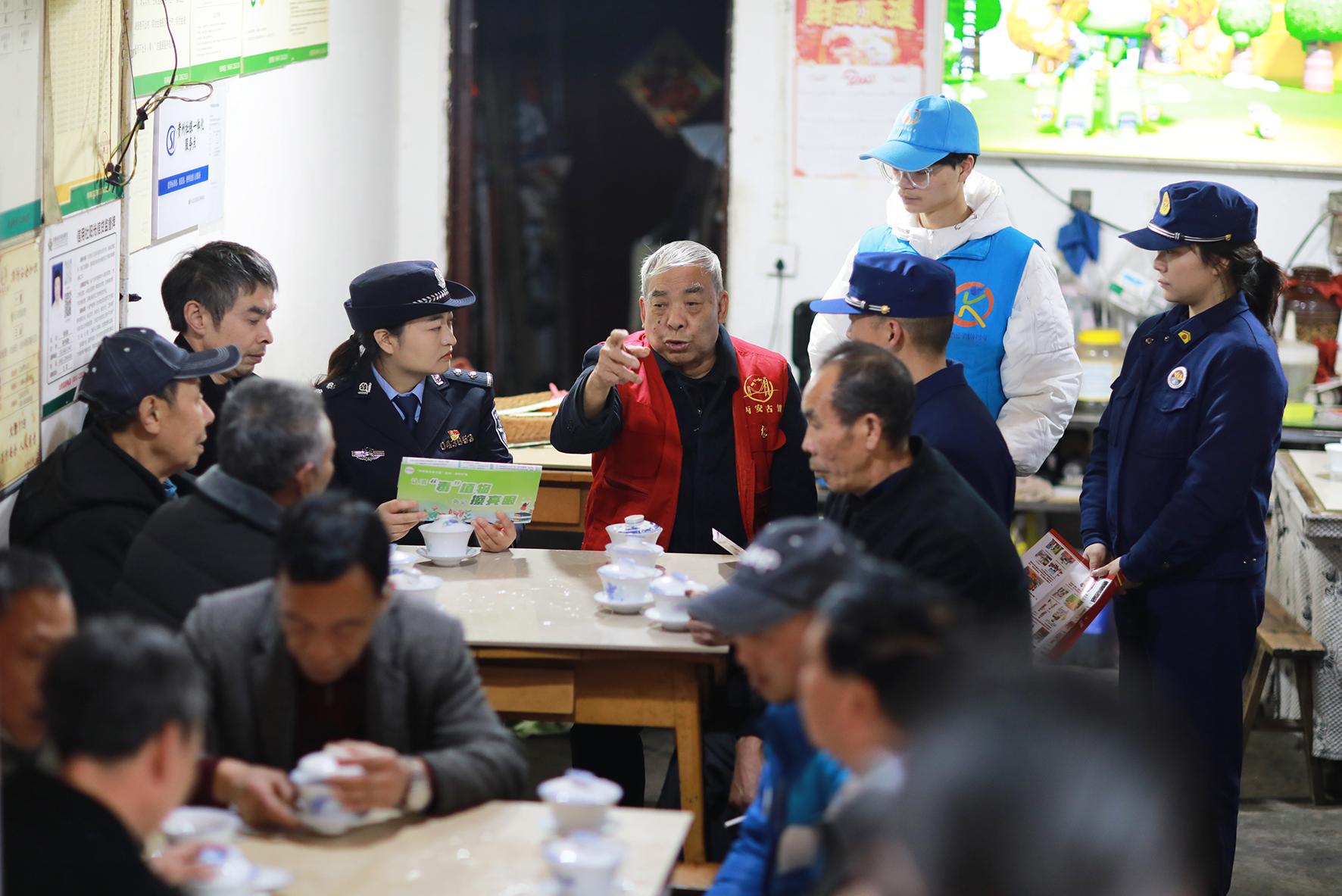 圖為2月20日,在丙安鎮(zhèn)一家茶館,民警與普法志愿者向群眾宣傳法律法規(guī)。
