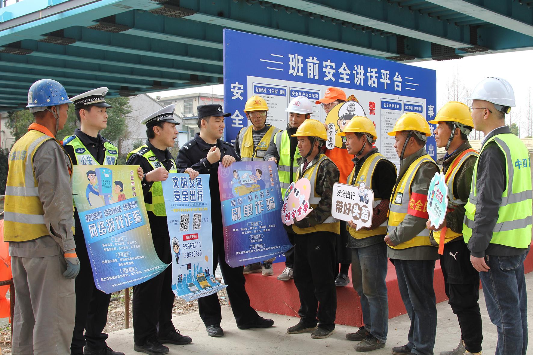 3月11日,上海市公安局嘉定分局交警支隊、徐行派出所民輔警會同平安志愿者走進滬渝蓉鐵路滬寧段二標(biāo)二分部建設(shè)工地,向務(wù)工人員開展交通安全、人口信息自主申報、反詐騙等知識宣講。