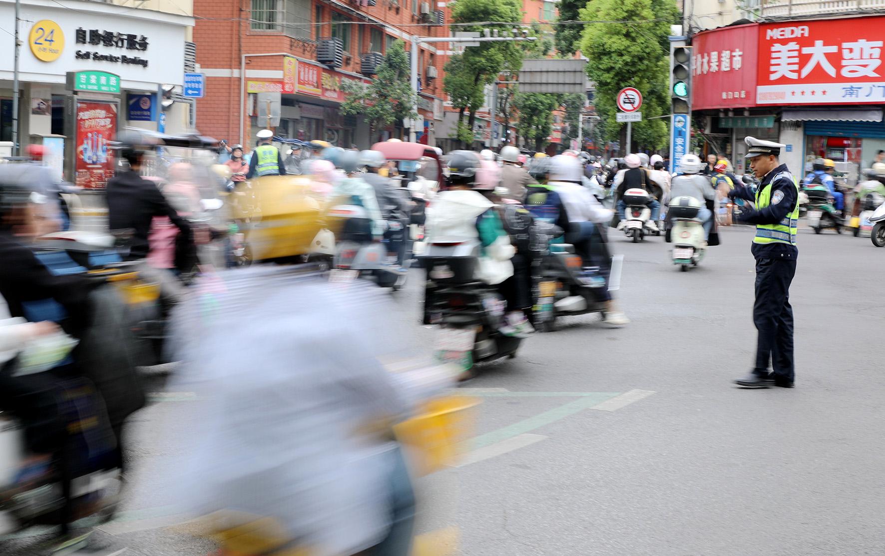 4月17日,江西省九江市公安局交管支隊(duì)第一大隊(duì)“護(hù)學(xué)崗”民警輔警在上學(xué)、放學(xué)交通高峰堅(jiān)守崗位,確保師生交通安全。