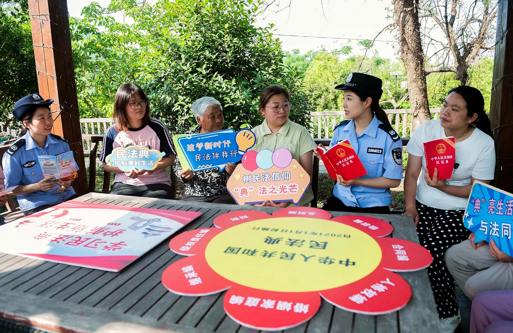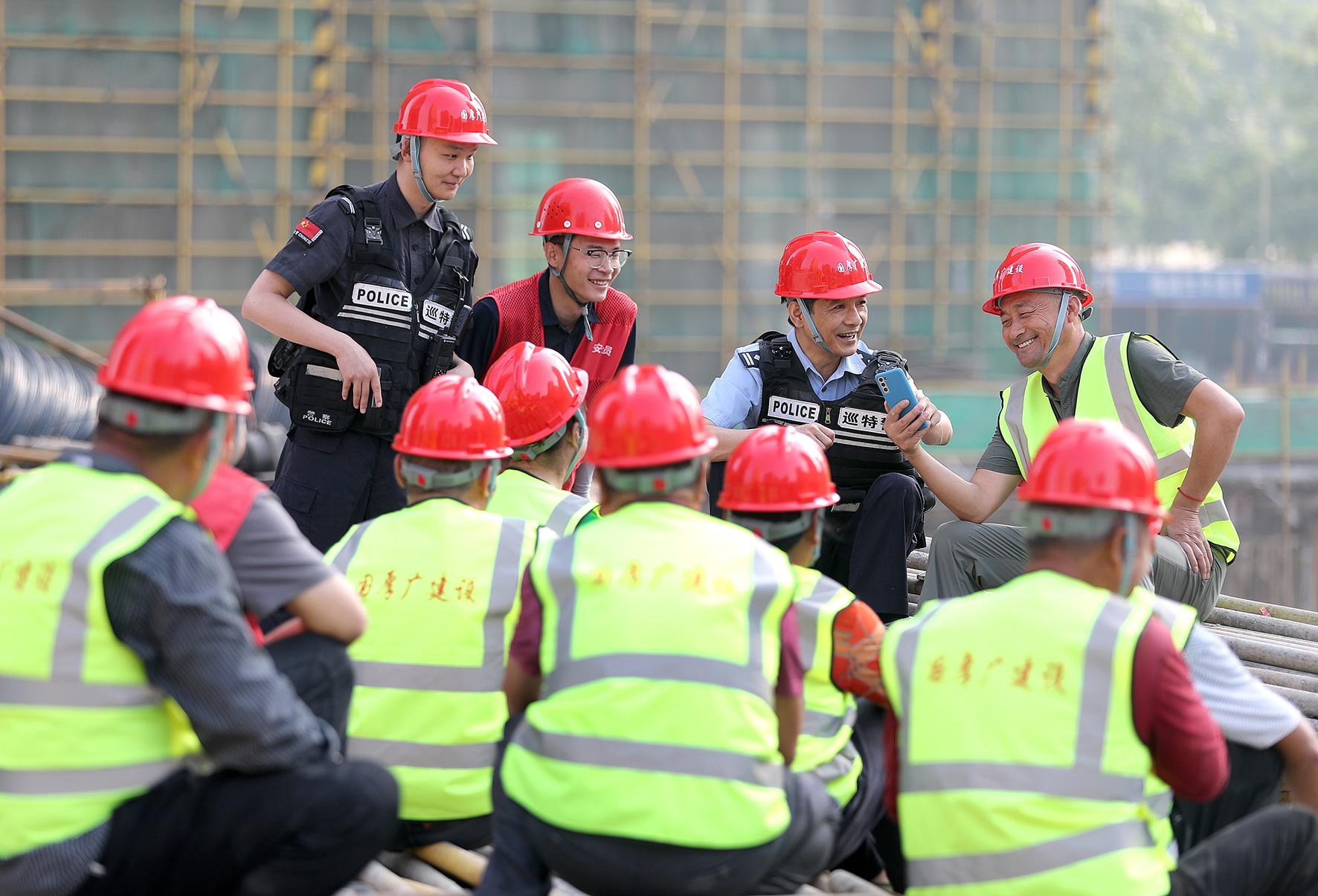 5月20日,在湖北省荊門市漳河新區(qū)一處建筑工地,荊門市公安局巡特警支隊(duì)生態(tài)運(yùn)動公園警務(wù)站民警利用“班前會”,向工友們普及民法典相關(guān)知識。