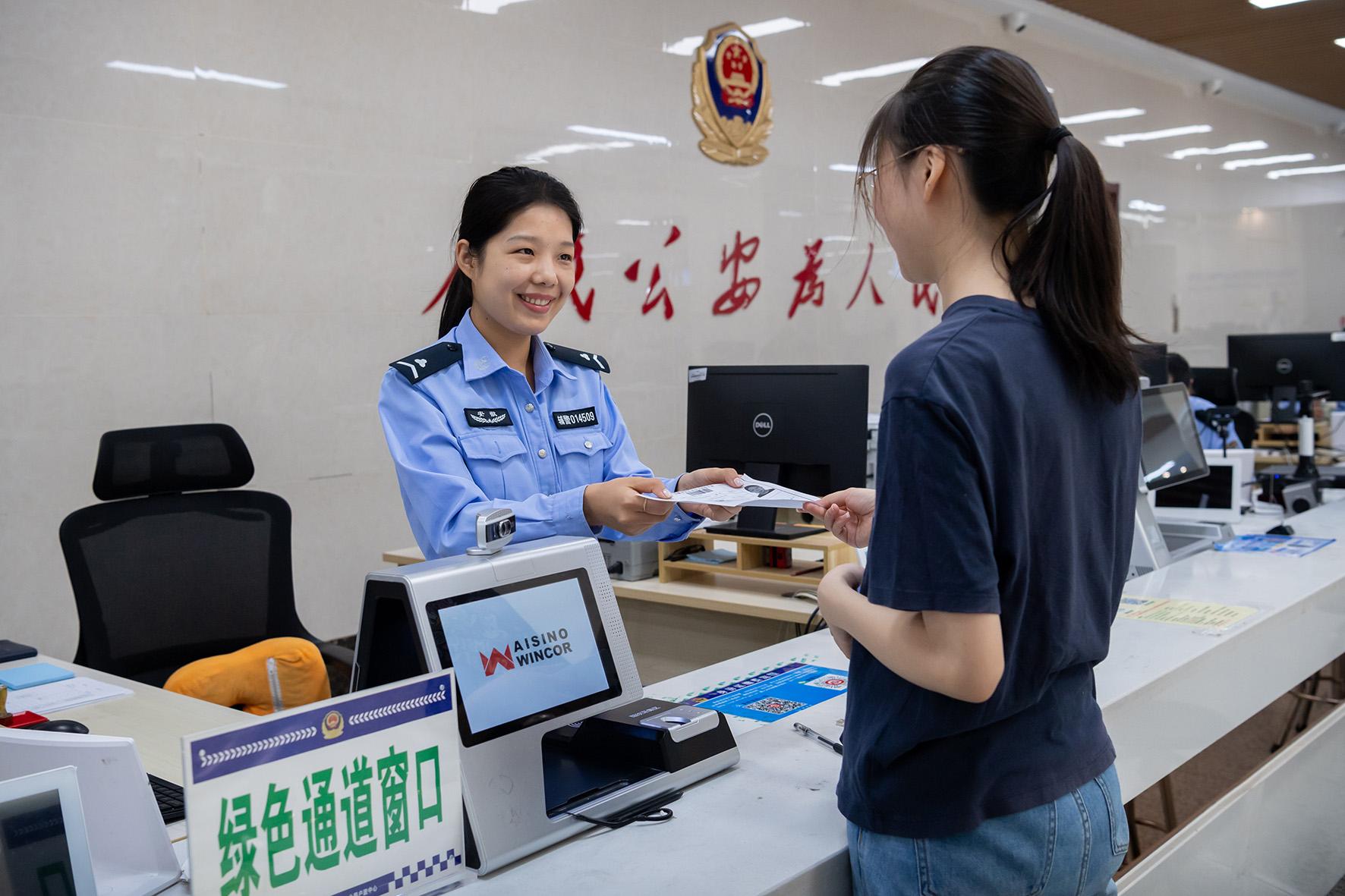 6月4日,安徽省合肥市公安局蜀山分局政務(wù)服務(wù)中心民輔警在考生“綠色通道”為考生辦理身份證件。