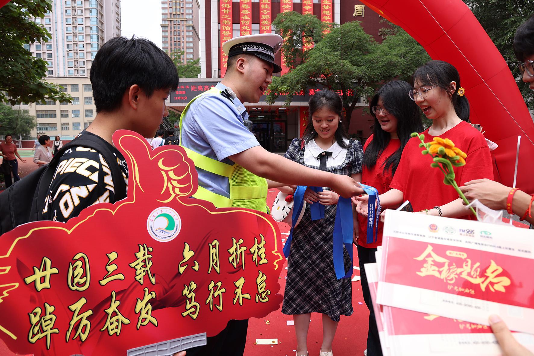 6月5日,遼寧省沈陽市公安局交通管理支隊和平大隊民警來到學(xué)校將護(hù)考“藍(lán)絲帶”送到考生手中,系有“藍(lán)絲帶”的車輛予以優(yōu)先放行,并倡導(dǎo)社會車輛主動讓行“藍(lán)絲帶”送考車輛。