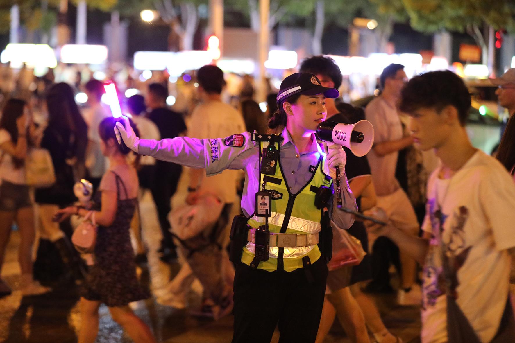 7月19日晚,安徽省合肥市公安局交警支隊(duì)民警在演出場館周邊維護(hù)道路交通秩序。