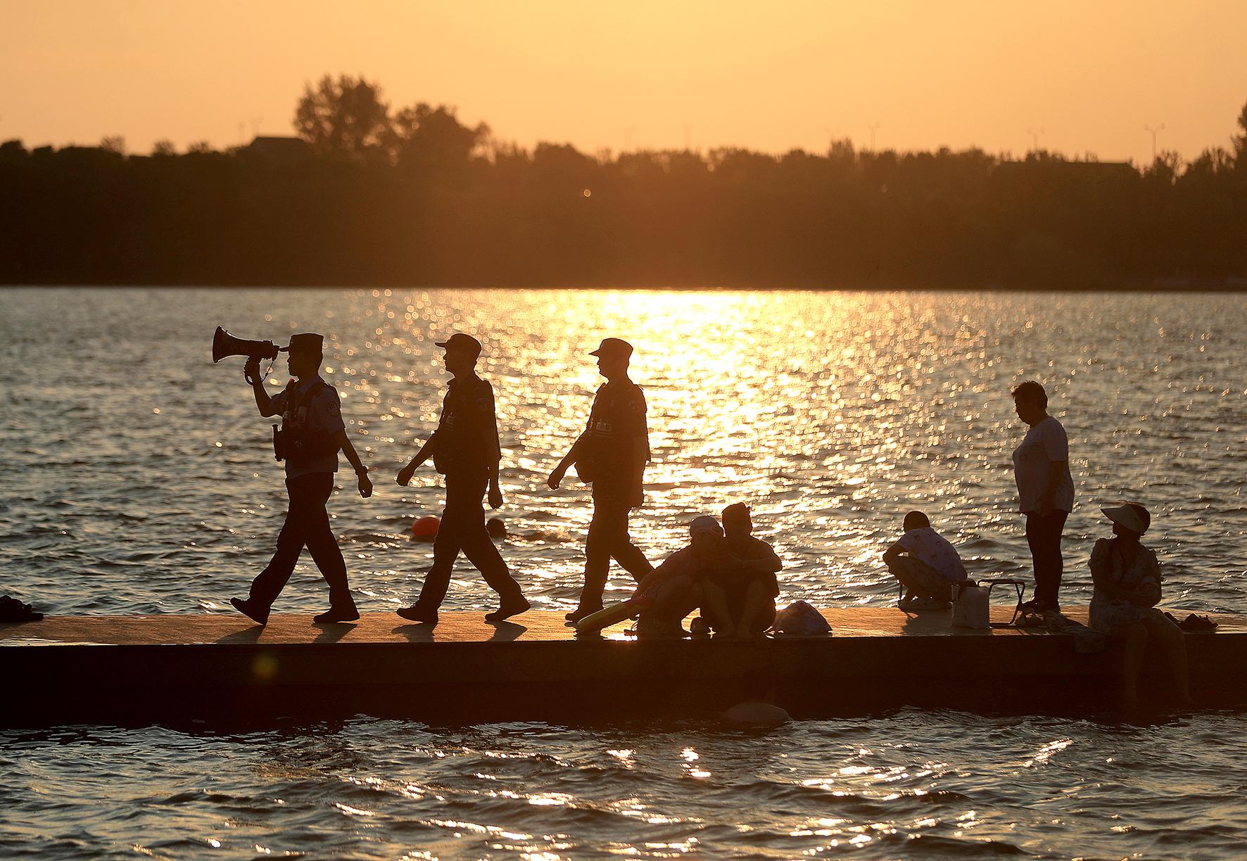 “水深危險,請勿游泳!”7月28日傍晚,湖北省荊門市公安局巡特警支隊生態(tài)運動公園警務(wù)站民警,手持喇叭沿鳳凰湖岸勸離野泳群眾。