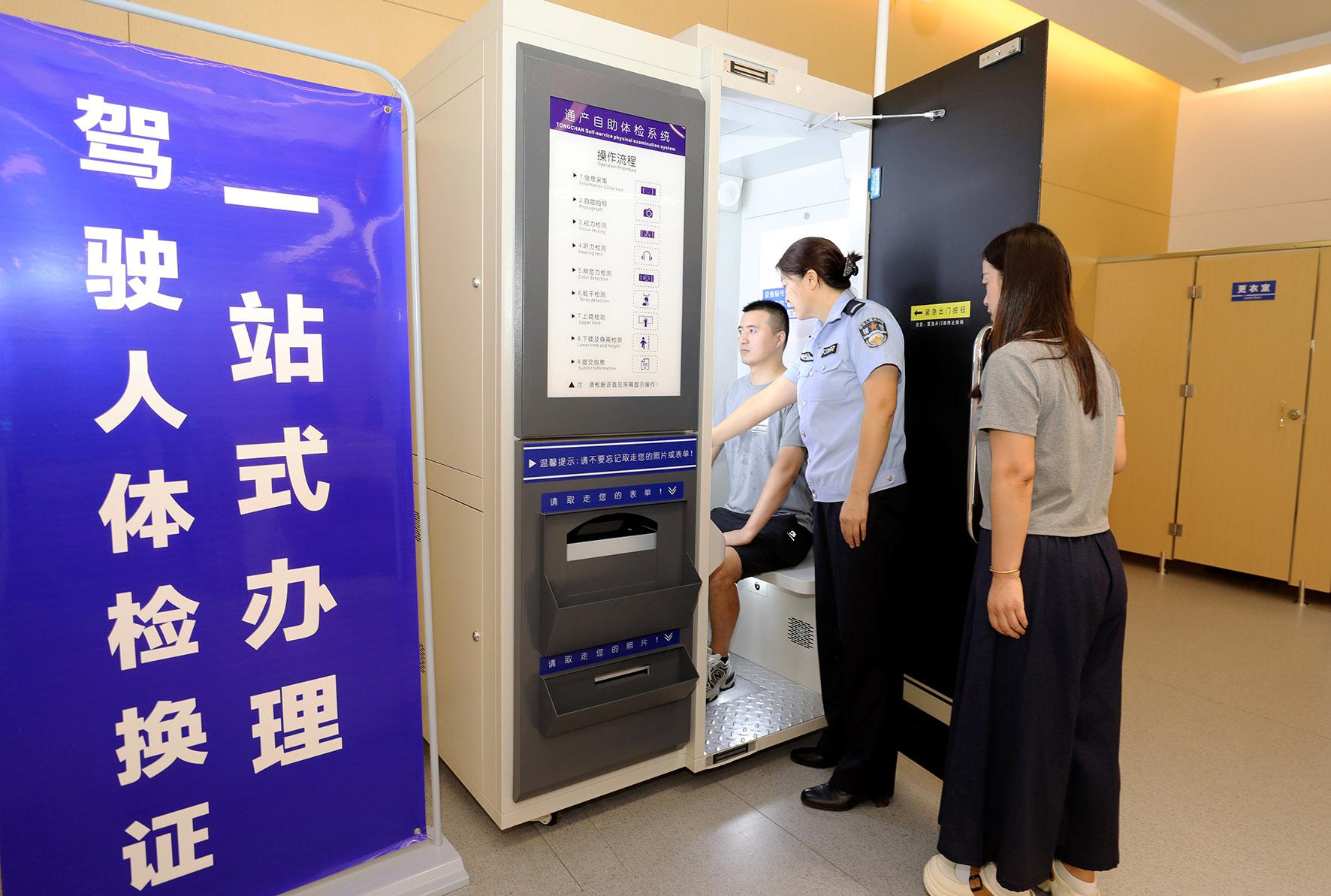 8月20日,安徽省淮北市政務服務大廳公安綜合窗口,工作人員指導換領駕駛證的群眾使用智能體檢設備。當日,淮北市政務服務大廳公安綜合窗口駕駛人智能自助體檢機投入使用,設備配備AI輔助診斷系統(tǒng)和后臺醫(yī)生審核。