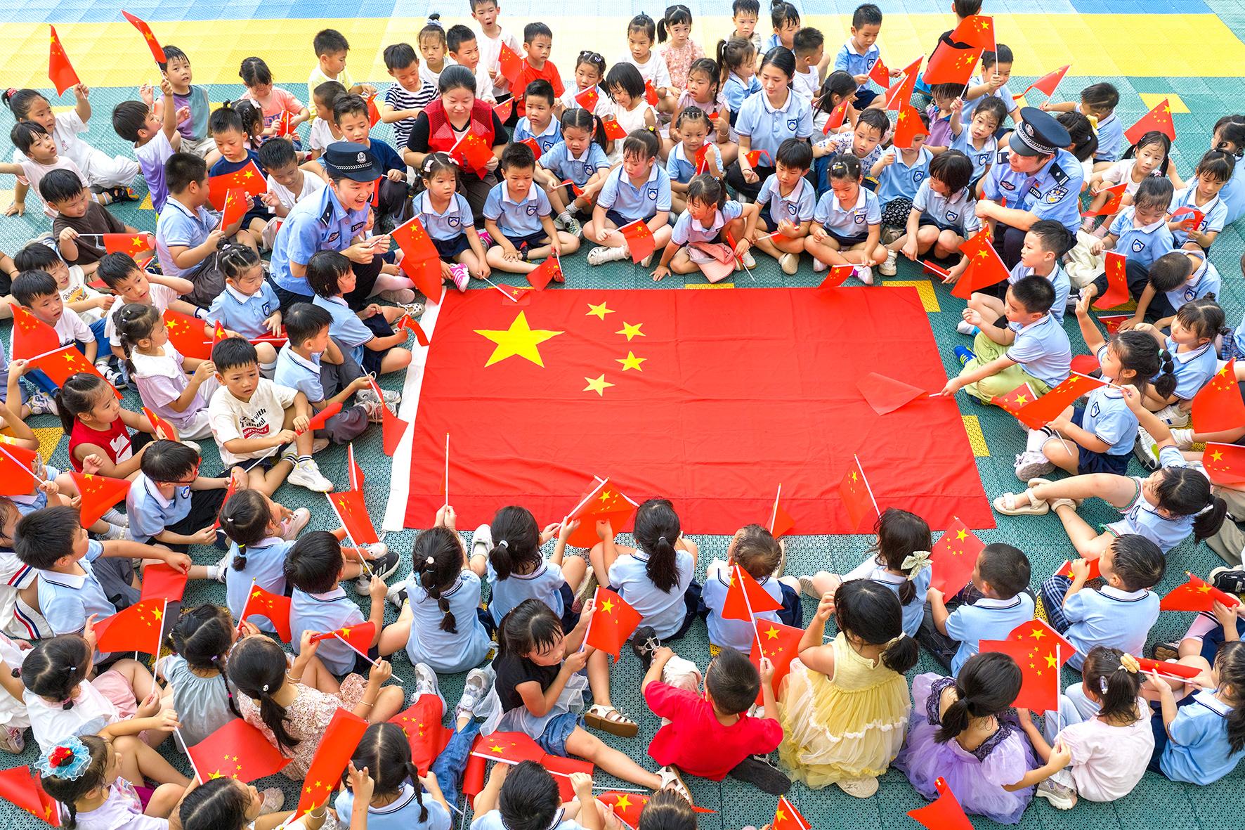 9月25日,浙江省臺(tái)州市公安局黃巖分局城東派出所民警和東城街道方山社區(qū)志愿者一起走進(jìn)轄區(qū)幼兒園,給孩子們講解國(guó)旗知識(shí)。