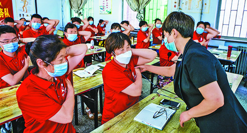 山西省萬榮縣人社部門采取在全縣多點(diǎn)講課的辦法,免費(fèi)對城鎮(zhèn)失業(yè)人員和農(nóng)村進(jìn)城務(wù)工人員進(jìn)行“萬榮人”勞務(wù)品牌相關(guān)培訓(xùn),助他們掌握一技之長,憑結(jié)業(yè)證上崗就業(yè)。圖為近日,在萬榮縣齊家職業(yè)培訓(xùn)學(xué)校,保健按摩老師在手把手教學(xué)員尋找人體穴位。李克榮