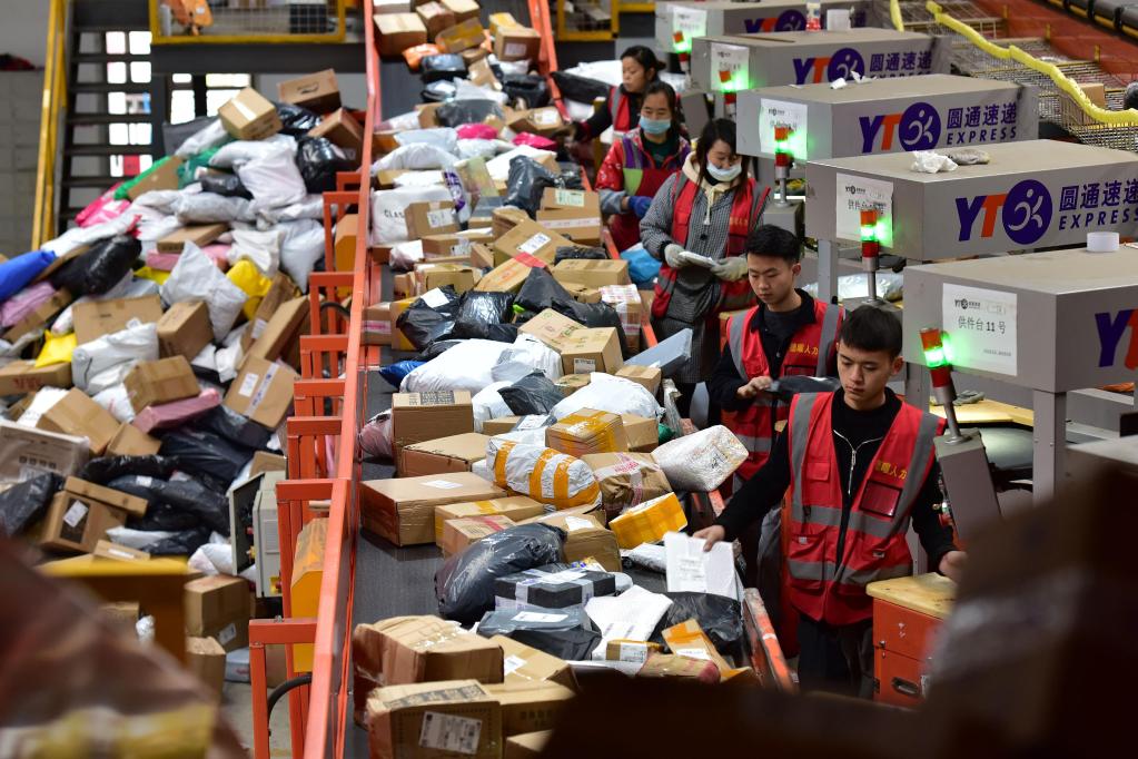 在位于貴州省龍里縣的貴州快遞物流園圓通速遞貴州分撥中心,工作人員分揀貨件。新華社發(fā)(龍毅 攝)