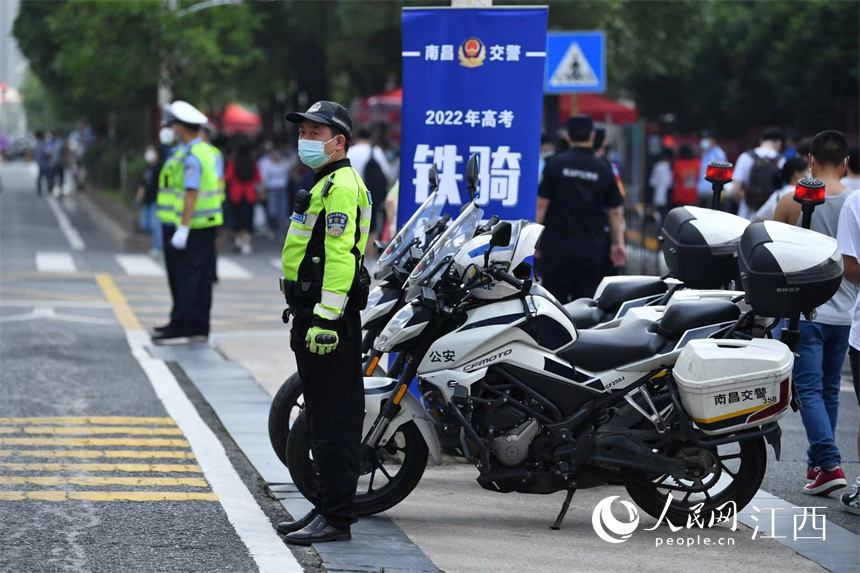 江西某考點(diǎn)前,交警“鐵騎”在考點(diǎn)周邊維持交通秩序。人民網(wǎng) 時(shí)雨攝
