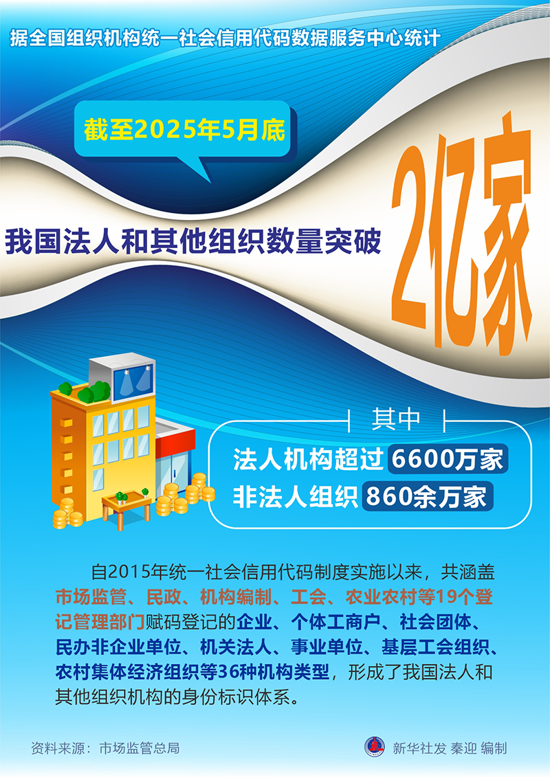 新華社北京6月30日電(記者趙文君)記者30日從市場監(jiān)管總局獲悉,據(jù)全國組織機構統(tǒng)一社會信用代碼數(shù)據(jù)服務中心統(tǒng)計,截至2025年5月底,我國法人和其他組織數(shù)量突破2億家,其中法人機構超過6600萬家、非法人組織860余萬家。