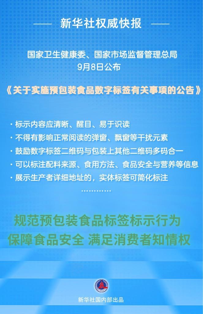國家衛(wèi)生健康委、國家市場監(jiān)督管理總局9月8日公布《關(guān)于實施預(yù)包裝食品數(shù)字標(biāo)簽有關(guān)事項的公告》。