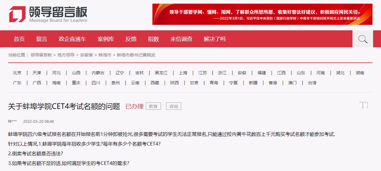 3月20日,有網(wǎng)民在人民網(wǎng)“領(lǐng)導(dǎo)留言板”向蚌埠市委書(shū)記留言稱,蚌埠學(xué)院四六級(jí)考試報(bào)名名額在開(kāi)始報(bào)名前1分鐘即被搶光,很多需要考試的學(xué)生無(wú)法正常報(bào)名,只能通過(guò)校內(nèi)黃?;〝?shù)百上千元購(gòu)買(mǎi)考試名額才能參加考試。請(qǐng)問(wèn)蚌埠學(xué)院每年招收多少學(xué)生?每年有多少個(gè)名額考CET4?倒賣(mài)考試名額是否違法?如果考試名額不足,如何滿足學(xué)生的考CET4的需求?