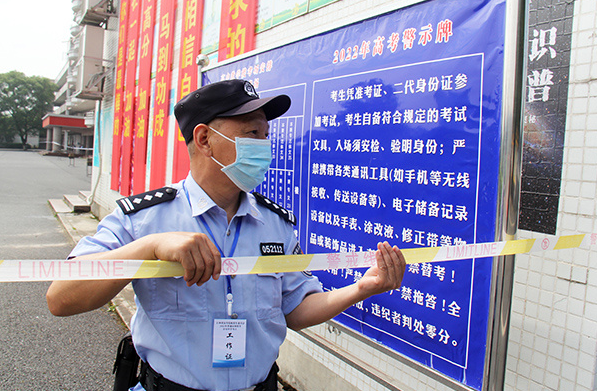 “考試結(jié)束,請考生停止作答。”6月9日上午11時許,隨著考場鈴聲響起,2022年高考最后一場考試結(jié)束了。在護送學生和家長有序離開后,老吳也用汗水和堅守交出了從警生涯最后一次護航高考的平安答卷。