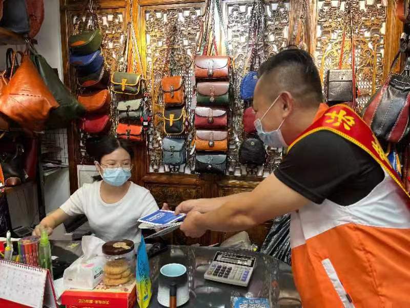 圖為廣州市白云區(qū)的社矯對(duì)象成為法治宣傳員,到皮具商鋪進(jìn)行法治宣傳。