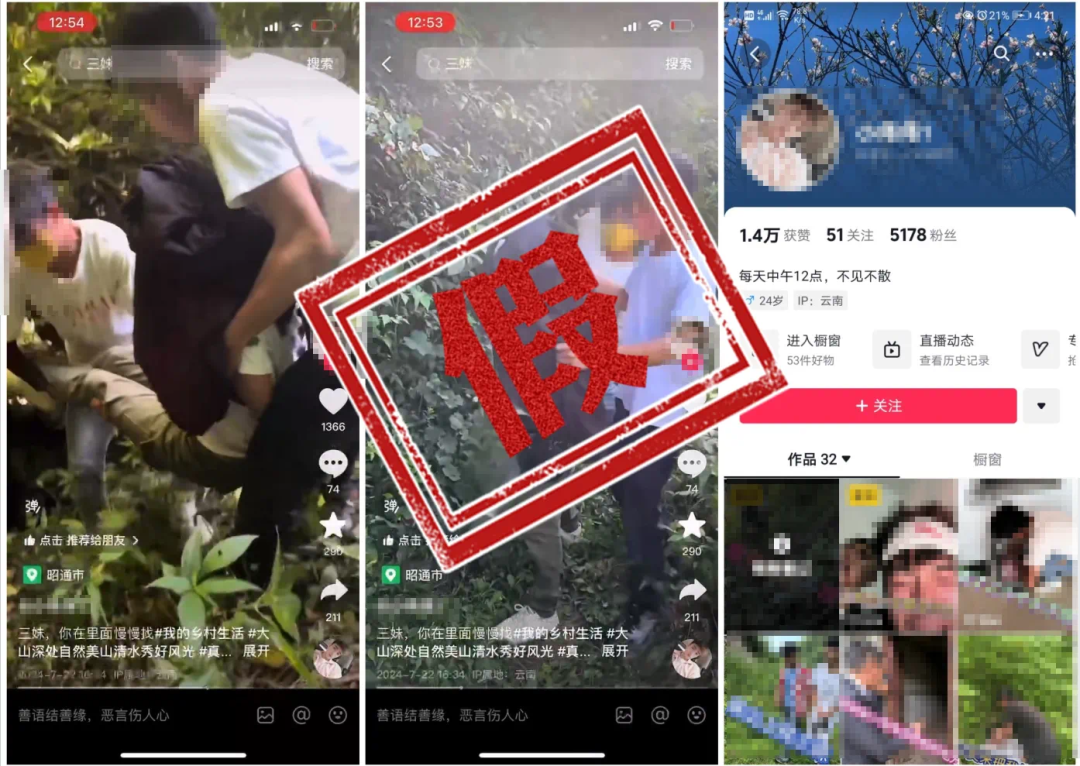 “婆媳勢不兩立”“婚姻一地雞毛”等以家庭矛盾為中心、以沖突為賣點的網(wǎng)絡(luò)虛假擺拍視頻并不鮮見,此類視頻往往密集制造沖突,放大家庭矛盾,且臺詞夸張、情節(jié)曲折。8月28日,抖音發(fā)布近期介入核實的網(wǎng)絡(luò)虛假擺拍典型案例,博主“是老王家的二姐呀”自稱在14歲至20歲期間被父母包辦3次婚姻,16歲時就和“大自己30歲的男子”生下兒子,并與幾個自稱“三妹”“大姐”的賬號互動頻繁,以矩陣賬號合力擺拍造假。涉事賬號被平臺采取封禁處理。10月,貴州畢節(jié)市七星關(guān)區(qū)網(wǎng)警與山東青島市網(wǎng)警先后通報“外來媳婦遭嫌棄毆打趕出家門后,躲進(jìn)山洞艱苦求生”“臨盆孕婦被丈夫遺棄荒山數(shù)日,孤立無援,無法下山求救”兩起虛假擺拍案例,相關(guān)涉案人員均被當(dāng)?shù)鼐浇o予行政處罰。