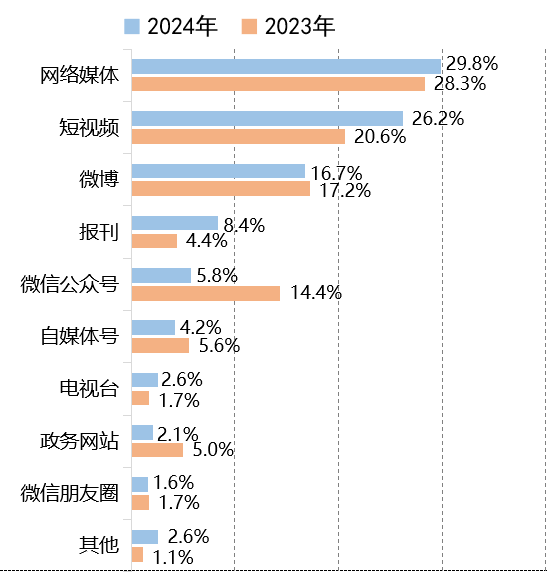 2024年,網(wǎng)絡(luò)媒體、短視頻、微博穩(wěn)居政法輿情發(fā)酵的主陣地,相關(guān)平臺(tái)產(chǎn)生的輿情數(shù)量占比累計(jì)72.7%。報(bào)刊、電視臺(tái)等專業(yè)性較強(qiáng)的傳統(tǒng)媒體仍占一席之地,由此發(fā)酵的輿情數(shù)量比重均有增長(zhǎng)。相比之下,源于微博、微信公眾號(hào)與政務(wù)網(wǎng)站的輿情數(shù)量有所減少。