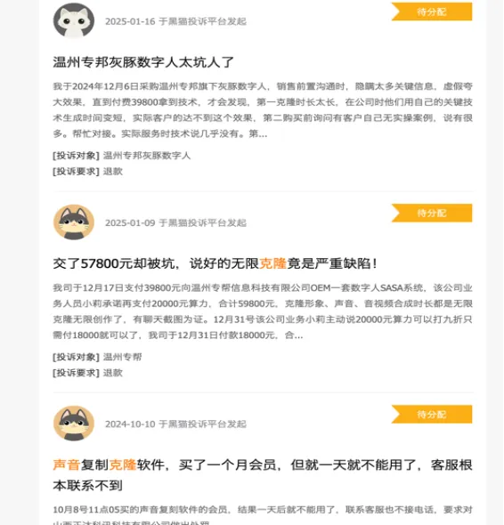 比如,有用戶(hù)投訴稱(chēng),克隆的聲音效果差,收費(fèi)不合理;有人稱(chēng)買(mǎi)了一個(gè)月會(huì)員,但僅用了一天就不能用了,客服也聯(lián)系補(bǔ)上;更有用戶(hù)稱(chēng),自己交了57800元卻被坑,軟件存在嚴(yán)重缺陷。