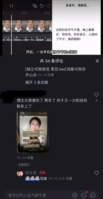 比如,今年5月12日,北大學(xué)生、AI博主“陳吐翡”曾發(fā)布一條題目為“淚崩!我用AI留住了爺爺?shù)穆曇簟钡囊曨l,在視頻中,她示范如何克隆爺爺?shù)穆曇簦八皇前俜职俚臓敔?,但偶爾,他?huì)蹦出一句特別像爺爺會(huì)說(shuō)的話(huà),我知道這不是他,但我忍不住想多聽(tīng)聽(tīng)?!标愅卖湔f(shuō)。