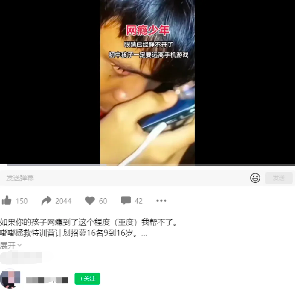 自詡“教育專家”“特訓教官”的網(wǎng)紅博主們,用同樣的話術,歇斯底里地控訴游戲,呼吁國家全面禁止游戲,刻意炮制萬千家長們希望孩子戒掉網(wǎng)癮、遠離游戲沉迷的焦慮,贏得了不少家長的點贊和轉(zhuǎn)發(fā),當然,還有消費;他們販賣的新型“戒網(wǎng)癮學?!薄笆罴偬赜枲I”“課程”動輒幾萬元,這些機構(gòu)提出的希望令家長們無法拒絕——“還您一個好孩子”。