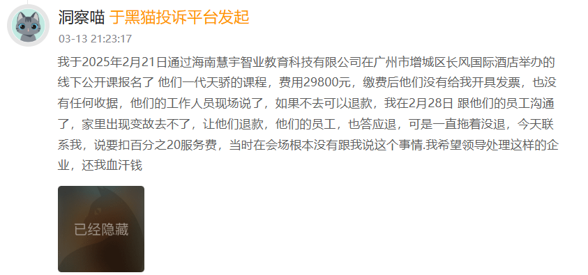 此外,在黑貓投訴上有多位消費者投訴該類開設課程機構(gòu)存在涉嫌偷稅截留、霸王扣款等問題。比如,一位女士投訴稱,在廣州報名公開課,現(xiàn)場支付費用29800元,繳費后機構(gòu)未開發(fā)票,工作人員口頭承諾“不去即退全款”。然而當其提出因計劃有變申請退款時,機構(gòu)拖延半月后突然提出“強扣20%服務費”。
