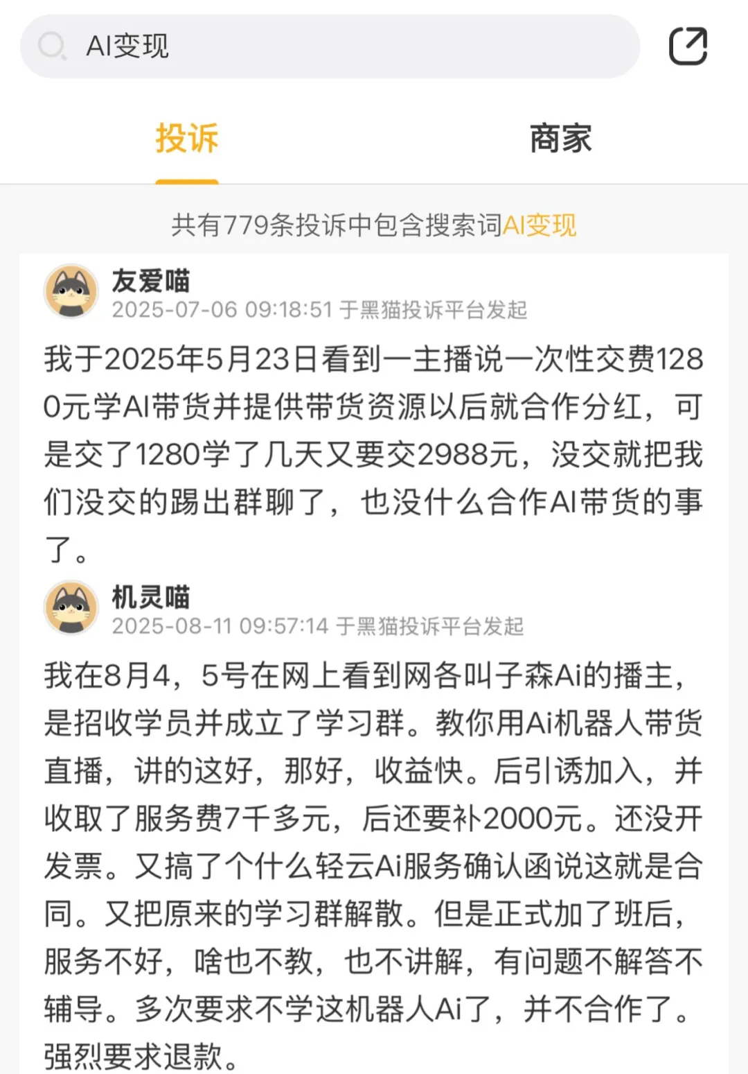 在黑貓投訴平臺上,有關(guān)“AI變現(xiàn)”的投訴已達700多條。不少投訴者提到,購買課程后不僅沒學到實質(zhì)內(nèi)容,還被商家誘導二次消費,一旦拒絕二次消費,就會被直接踢出交流群。