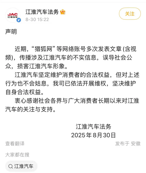 而在前一天的8月30日,@江淮汽車法務(wù)發(fā)布聲明:近期,“獵狐網(wǎng)”等網(wǎng)絡(luò)賬號(hào)多次發(fā)表文章(含視頻),傳播涉及江淮汽車的不實(shí)信息,誤導(dǎo)社會(huì)公眾,損害江淮汽車形象。江淮汽車堅(jiān)定維護(hù)消費(fèi)者的合法權(quán)益,但對(duì)上述行為也不會(huì)姑息,我司已依法開(kāi)展維權(quán),堅(jiān)決維護(hù)自身合法權(quán)益。