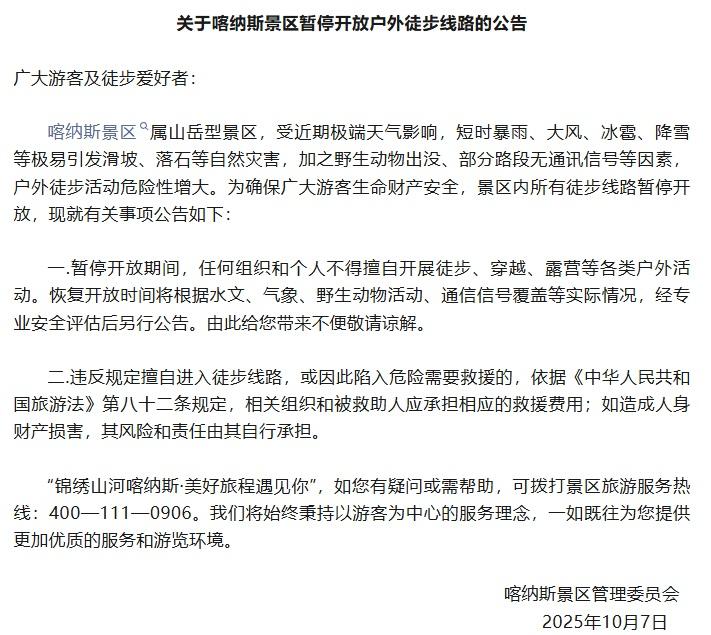 近日,新疆喀納斯景區(qū)出現(xiàn)暴雪天氣造成省道S232線49公里至57公里等路段出現(xiàn)嚴(yán)重積雪結(jié)冰,道路通行條件惡劣導(dǎo)致大量游客車輛滯留。經(jīng)除雪除冰作業(yè),喀納斯景區(qū)道路已經(jīng)能夠通行,受暴雪影響的滯留游客已全部到達(dá)目的地。10月7日上午,喀納斯景區(qū)管理委員會發(fā)布《關(guān)于喀納斯景區(qū)暫停開放戶外徒步線路的公告》。