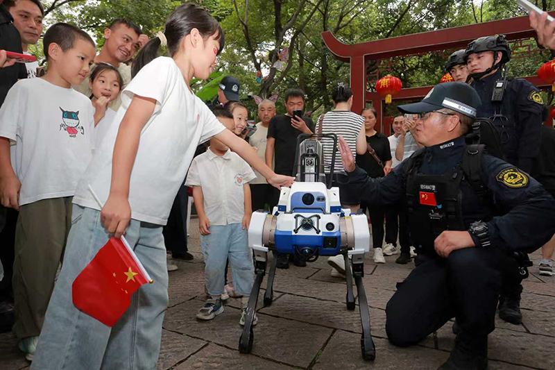 10月5日,在浙江湖州南潯古鎮(zhèn)景區(qū)南大門的連廊里,一群孩子手拿國旗,圍著一只機(jī)器狗歡呼雀躍,時不時還合影打卡?!八木幪柺荄007?!币慌缘奶鼐爢T一邊配合著拍照,一邊詳細(xì)介紹這位“新戰(zhàn)友”。