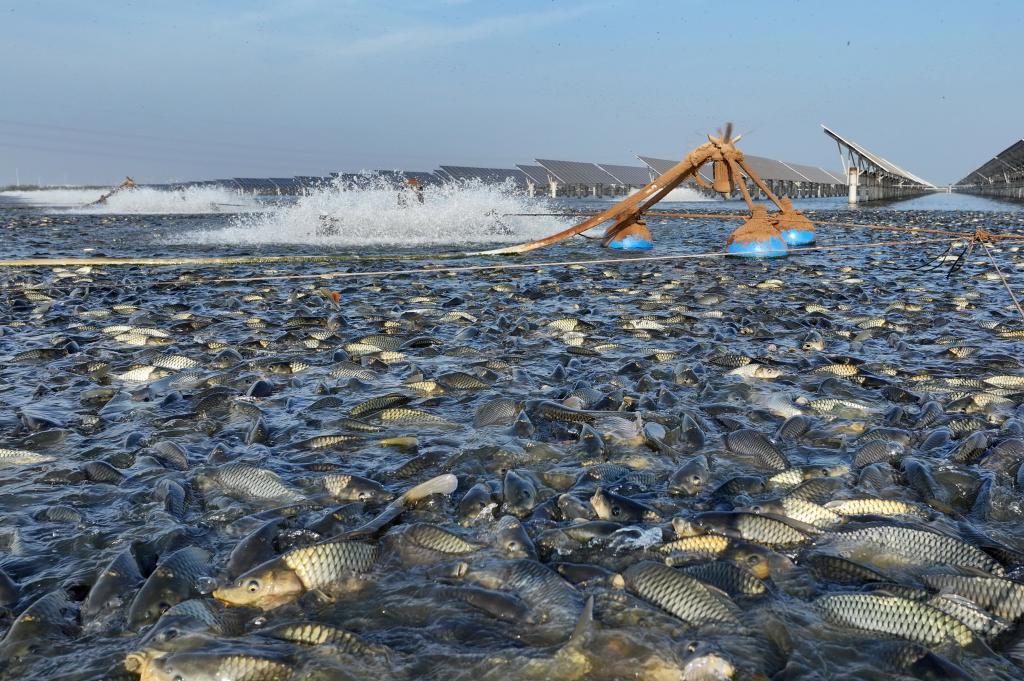 這是河北省唐山市豐南區(qū)黑沿子鎮(zhèn)“漁光一體”現(xiàn)代漁業(yè)產(chǎn)業(yè)園魚塘內(nèi)場(chǎng)景(無人機(jī)照片)。新華社記者 楊世堯 攝