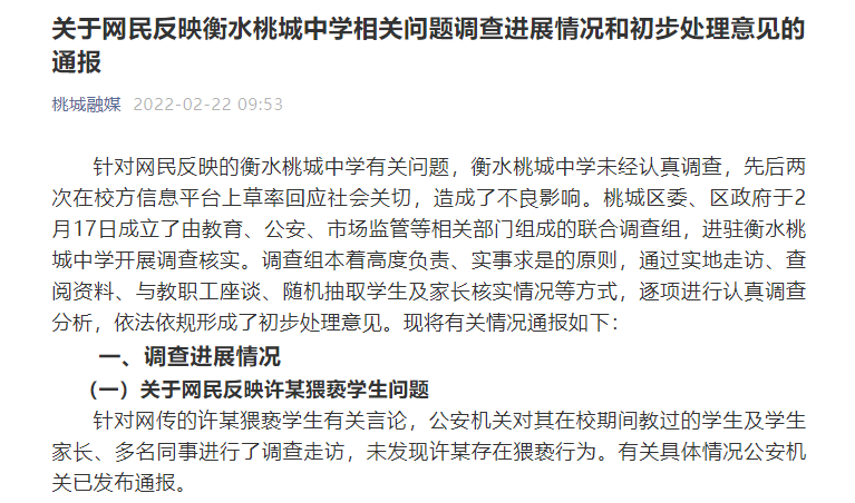 關(guān)于網(wǎng)民反映衡水桃城中學(xué)相關(guān)問題調(diào)查進(jìn)展情況和初步處理意見的通報(bào)