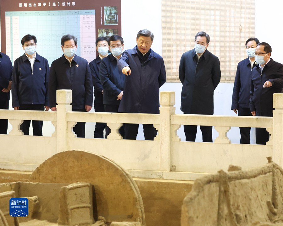 28日下午,習近平考察了位于安陽市西北郊洹河南北兩岸的殷墟遺址。殷墟是我國歷史上第一個文獻可考、為考古發(fā)掘所證實的商代晚期都城遺址。習近平步入殷墟博物館,仔細觀摩青銅器、玉器、甲骨文等出土文物。隨后,習近平來到車馬坑展廳,察看商代畜力車實物標本和道路遺跡。他指出,殷墟出土的甲骨文為我們保存3000年前的文字,把中國信史向上推進了約1000年。殷墟我向往已久,這次來是想更深地學習理解中華文明,古為今用,為更好建設中華民族現(xiàn)代文明提供借鑒。中國的漢文字非常了不起,中華民族的形成和發(fā)展離不開漢文字的維系。在這方面,考古事業(yè)居功至偉。考古工作要繼續(xù)重視和加強,繼續(xù)深化中華文明探源工程。中華文明源遠流長,從未中斷,塑造了我們偉大的民族,這個民族還會偉大下去的。要通過文物發(fā)掘、研究保護工作,更好地傳承優(yōu)秀傳統(tǒng)文化。習近平強調(diào),中華優(yōu)秀傳統(tǒng)文化是我們黨創(chuàng)新理論的“根”,我們推進馬克思主義中國化時代化的根本途徑是“兩個結(jié)合”。我們要堅定文化自信,增強做中國人的自信心和自豪感。
