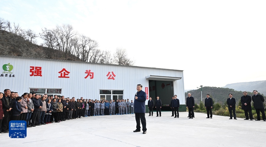 車間外,老鄉(xiāng)們聚集在一起,高聲向總書記問好。習近平同老鄉(xiāng)們拉起家常,回憶當年他在陜北的知青歲月。習近平對老鄉(xiāng)們說,我在陜北生活了7年,當年看到老鄉(xiāng)們生活很艱苦,心里就想著怎么樣讓大家生活好起來。這次來延安,看到一派碩果累累的豐收景象,交通條件大為改善,發(fā)生了翻天覆地的變化。過去陜北老鄉(xiāng)們修梯田、種莊稼,面朝黃土背朝天,掄起老鋤頭干活,廣種薄收,十分辛苦,如今山坡上退耕還林種上了蘋果,老鄉(xiāng)們有工作、有穩(wěn)定收入,孩子有好的教育,老人都有醫(yī)保,生活越來越好。從陜北的變化就可以看到中國的變化。習近平指出,現(xiàn)在,“兩個一百年”奮斗目標的第一個百年目標已經(jīng)實現(xiàn),絕對貧困問題解決了,老鄉(xiāng)們過上了好日子,但還要繼續(xù)努力往前走,讓生活越來越美好。陜北的氣候、光照、緯度、海拔等非常適宜發(fā)展蘋果種植,加上滴灌技術(shù)、矮化種植技術(shù)、選果生產(chǎn)線等不斷發(fā)展,就地賣出,銷路不愁,大力發(fā)展蘋果種植業(yè)可謂天時地利人和,這是最好的、最合適的產(chǎn)業(yè),大有前途。習近平強調(diào),中國共產(chǎn)黨是人民的黨,是為人民服務的黨,共產(chǎn)黨當家就是要為老百姓辦事,把老百姓的事情辦好??照務`國,實干興邦。要認真學習貫徹黨的二十大精神,全面推進鄉(xiāng)村振興,把富民政策一項一項落實好,加快推進農(nóng)業(yè)農(nóng)村現(xiàn)代化,讓老鄉(xiāng)們生活越來越紅火。老鄉(xiāng)們爆發(fā)出雷鳴般的掌聲。