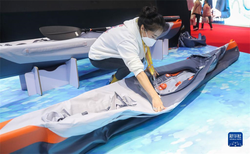 工作人員在第三屆中國國際進口博覽會消費品展區(qū)的迪卡儂展臺演示可折疊皮劃艇如何安裝(2020年11月6日攝)。新華社記者 丁汀 攝