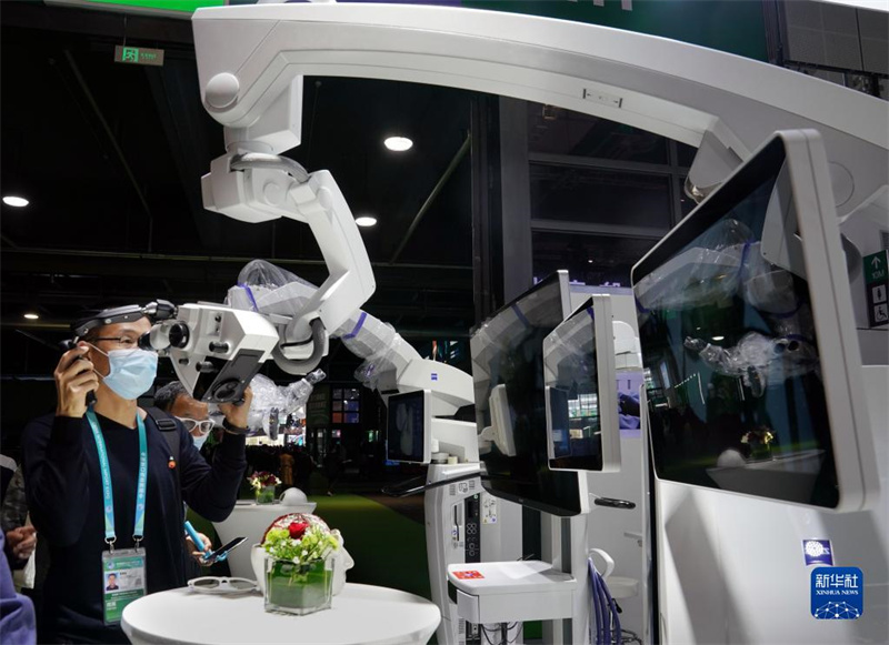 在第三屆中國國際進口博覽會醫(yī)療器械及醫(yī)藥保健展區(qū)蔡司集團展臺,參觀者體驗手術顯微鏡(2020年11月6日攝)。新華社記者 劉穎 攝