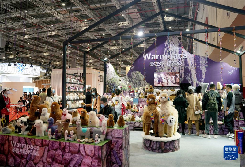 第四屆中國國際進口博覽會消費品展區(qū)的秘魯羊駝毛玩偶展臺(2021年11月6日攝)。新華社記者 劉穎 攝