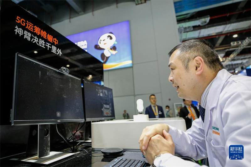 一位超聲科醫(yī)生在第二屆中國國際進口博覽會上使用西門子5G醫(yī)療遠程超聲解決方案,與重慶市彭水苗族土家族自治縣紹慶街道社區(qū)衛(wèi)生服務中心?的超聲醫(yī)生進行遠程實時高清超聲圖像傳輸和音視頻對話(2019年11月6日攝)。新華社記者 張玉薇 攝