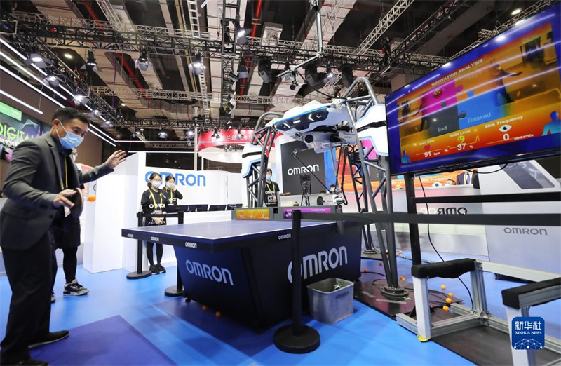 在第三屆中國國際進口博覽會期間,一名男子體驗與歐姆龍公司的一款乒乓球教練機器人對戰(zhàn),右側屏幕上實時顯示他的心率和情緒指數(2020年11月5日攝)。新華社記者 方喆 攝