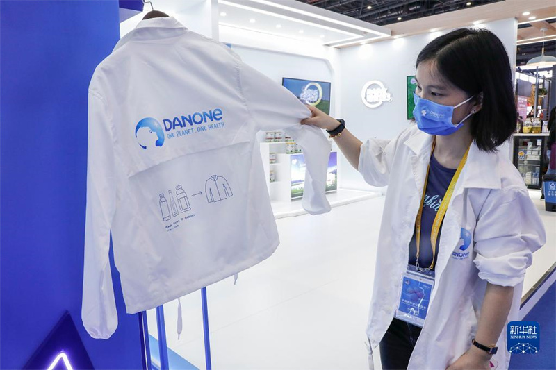 工作人員在第四屆中國國際進口博覽會食品和農產品展區(qū)達能展臺展示用塑料飲料空瓶制造的外套(2021年11月6日攝)。新華社記者 張玉薇 攝
