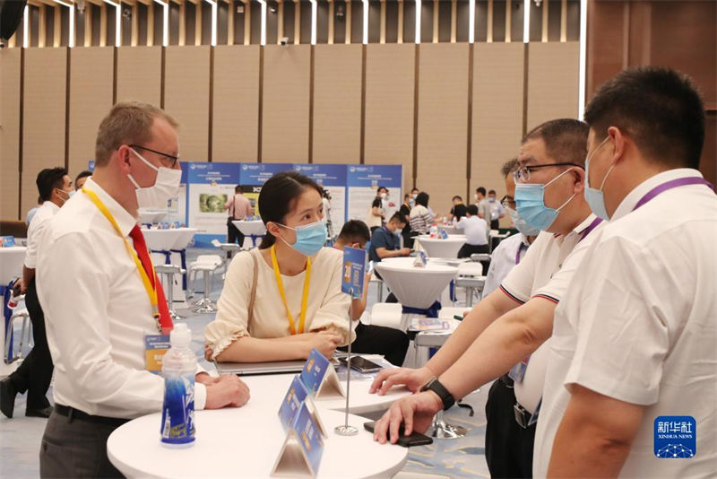 在第五屆中國國際進口博覽會技術(shù)裝備展區(qū)展前供需對接會上,參展商代表(前左二)向采購商介紹企業(yè)產(chǎn)品情況(2022年8月8日攝)。新華社記者 方喆 攝