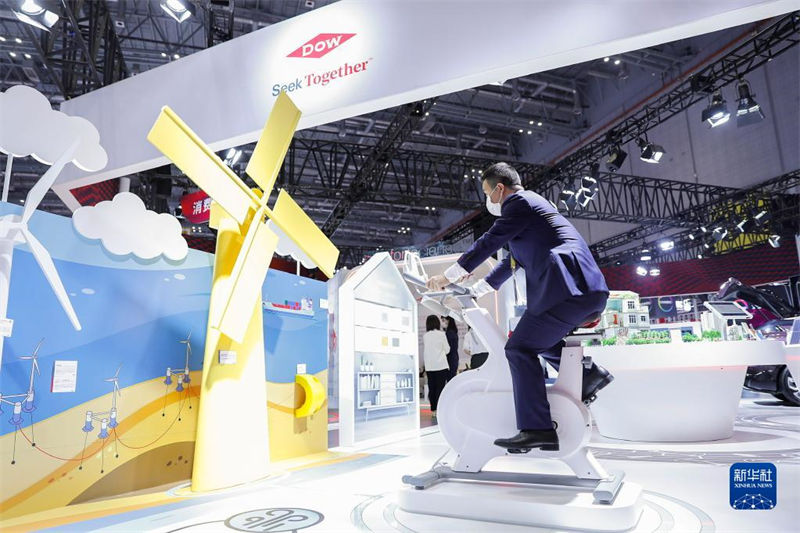 2021年11月5日,工作人員在第四屆中國國際進口博覽會能源低碳及環(huán)保技術(shù)專區(qū)一展臺演示環(huán)保發(fā)電互動裝置。新華社記者 張玉薇 攝