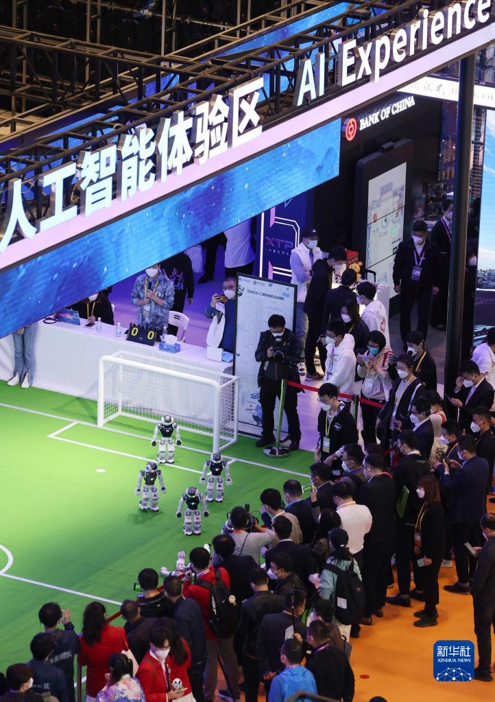 2022年11月5日,參觀者在第五屆中國國際進口博覽會人工智能專區(qū)觀看機器人表演。新華社記者 金立旺 攝