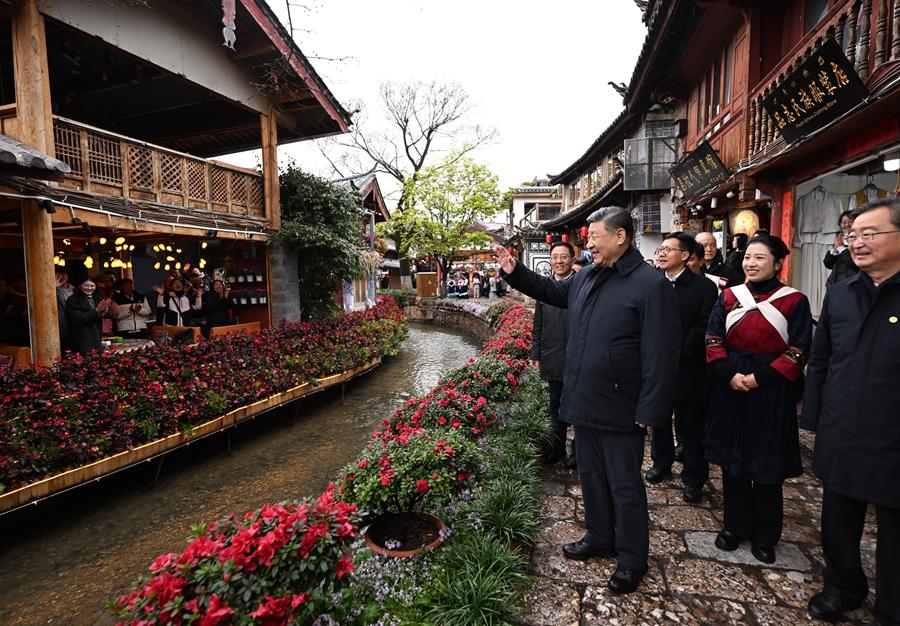 3月19日至20日,中共中央總書記、國家主席、中央軍委主席習近平在云南考察。這是19日下午,習近平在麗江古城考察時,與居民、游客互動交流。新華社記者 燕雁 攝